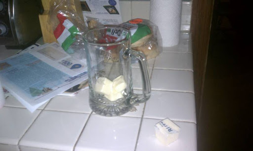 And we put butter (don't judge, it was a lot of bread) and garlic (4 cloves, I think) into the microwave till the butter melted.