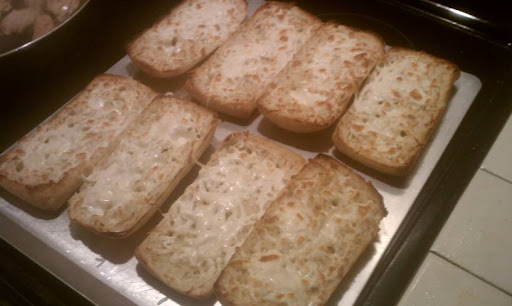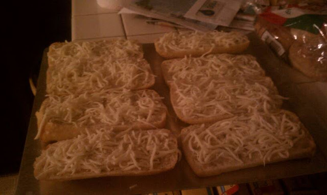 First, we made garlic bread. NES and KEB both make garlic bread the same way, and it's the best garlic bread I've ever had. Mmm. I am sometimes not a fan of the fake garlic bread that comes from the store or is really greasy. This is way too good to be disliked. Way too good.