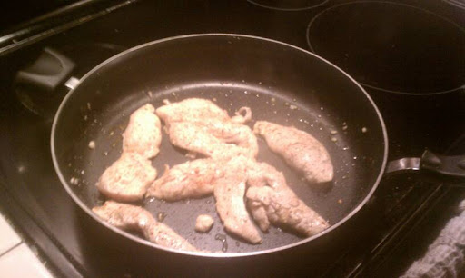 Meanwhile, NES cut up some chicken breasts into thinner strips and sauted it in olive oil with black pepper, red pepper, cayenne pepper, more garlic, and he deglazed the pan wuth cream sherry.